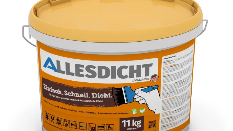 ALLESDICHT – gumowa powłoka prosto z wiadra – to innowacyjna, wodna masa uszczelniająca przeznaczona do renowacji, napraw i nowych inwestycji budowlanych. Gęsty materiał aplikuje się bezpośrednio z wiadra, a po wyschnięciu tworzy elastyczną i bezszwową gumową warstwę. Zapewnia trwałą ochronę przed wodą opadową i podciąganiem kapilarnym – nawet w miejscach trudnych, takich jak przejścia rurowe, połączenia i narożniki.