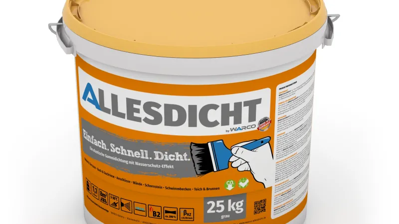 ALLESDICHT – gumowa powłoka prosto z wiadra – to innowacyjna, wodna masa uszczelniająca przeznaczona do renowacji, napraw i nowych inwestycji budowlanych. Gęsty materiał aplikuje się bezpośrednio z wiadra, a po wyschnięciu tworzy elastyczną i bezszwową gumową warstwę. Zapewnia trwałą ochronę przed wodą opadową i podciąganiem kapilarnym – nawet w miejscach trudnych, takich jak przejścia rurowe, połączenia i narożniki.