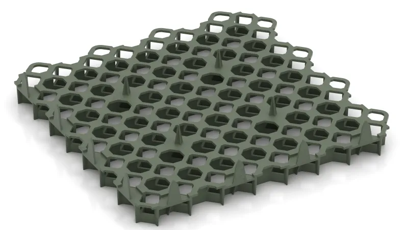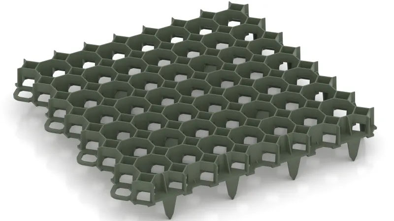 Od spodu kratki wyposażone są w kolce o długości ok. 4 cm, które aktywnie zakotwiczają je w gruncie. Z dwóch stron znajdują się zaczepy, które łączą elementy w stabilną, spójną siatkę. Po wypełnieniu grysem powierzchnia wytrzymuje obciążenia do 400 t/m².