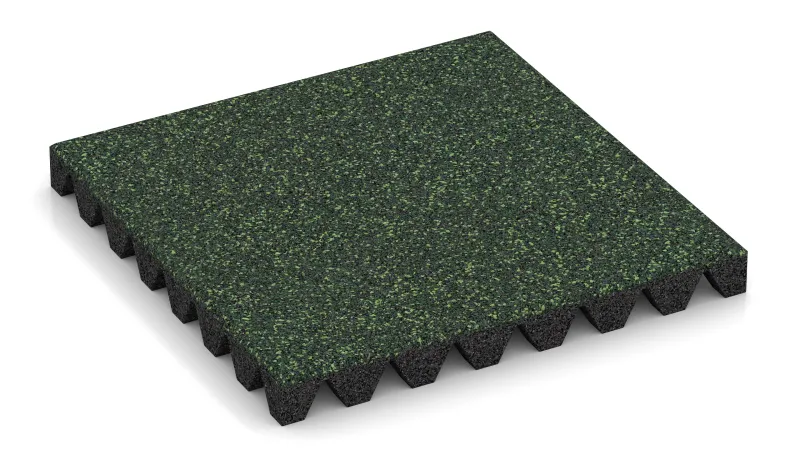 Płyty wykonane są z granulatu gumowego wiązanego PU, o sprężystej i antypoślizgowej powierzchni. Grubość i gęstość decydują o właściwościach amortyzacyjnych i przypisanej wysokości upadku według EN 1177. Siatka 50 × 50 cm minimalizuje odpady przy docinaniu, a pojedyncze płyty można w razie potrzeby łatwo wymienić.