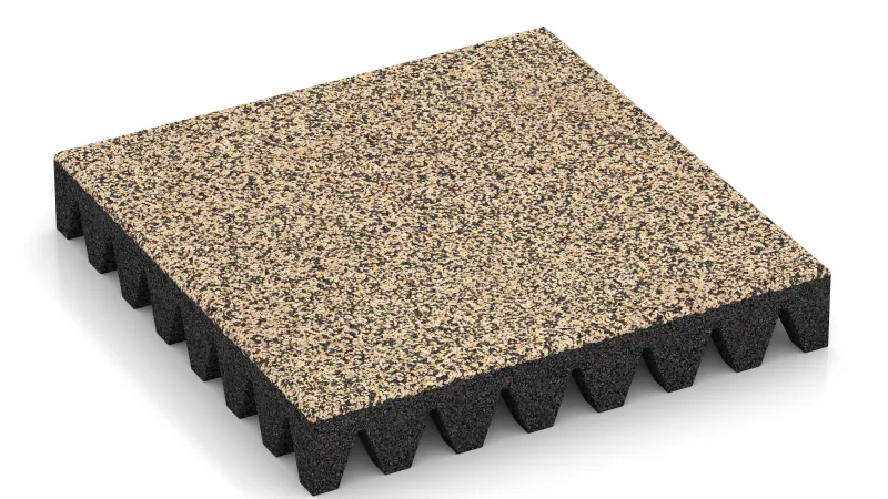 Płyty wykonane są z granulatu gumowego wiązanego PU, o sprężystej i antypoślizgowej powierzchni. Grubość i gęstość decydują o właściwościach amortyzacyjnych i przypisanej wysokości upadku według EN 1177. Siatka 50 × 50 cm minimalizuje odpady przy docinaniu, a pojedyncze płyty można w razie potrzeby łatwo wymienić.