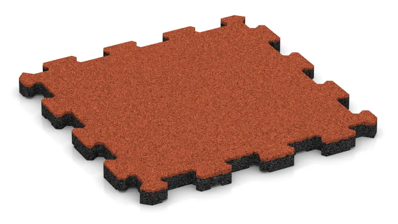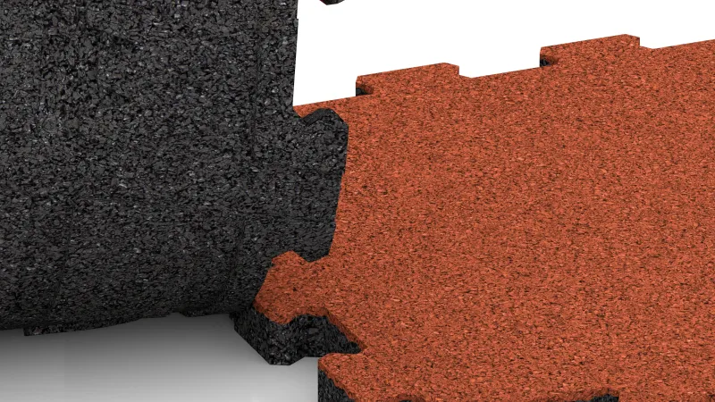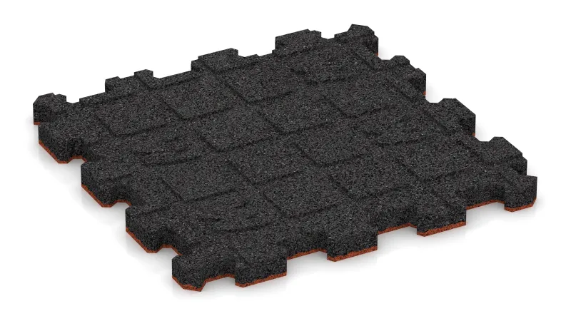 Płytki powstają z granulatu gumowego łączonego poliuretanem. Duże bloki są prasowane, pozostawiane do utwardzenia, a następnie precyzyjnie wycinane. W ten sposób uzyskuje się kalibrowane elementy o dokładnych wymiarach i gładkiej powierzchni – co ułatwia montaż i podnosi estetykę wykończenia.