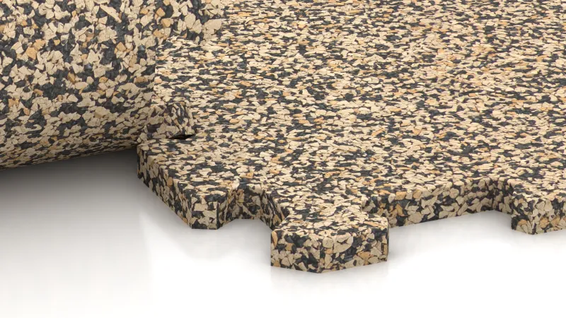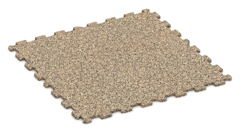 Płytki powstają z granulatu gumowego łączonego poliuretanem. Duże bloki są prasowane, pozostawiane do utwardzenia, a następnie precyzyjnie wycinane. W ten sposób uzyskuje się kalibrowane elementy o dokładnych wymiarach i gładkiej powierzchni – co ułatwia montaż i podnosi estetykę wykończenia.